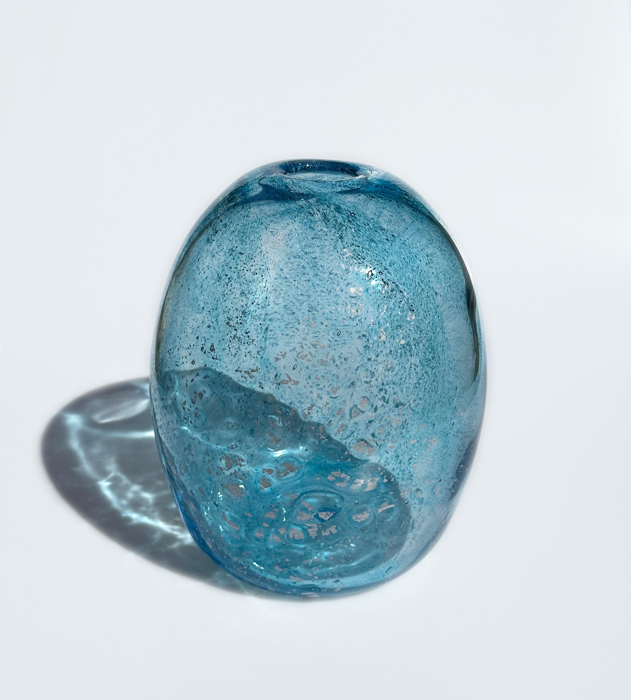 Only two original pieces remaining from the Drift Collection, which included sculptural and functional pieces such as lamps and vases. This collection was is inspired by the quiet, constant movement of objects drifting through the ocean—pulled by unseen tides, reshaped by salt and time. Each handblown piece captures a sense of weightless motion, with suspended silver scatter across the copper blue of the glass beneath the surface. The result is a series of luminous works that feel both ancient and otherworldly.