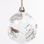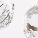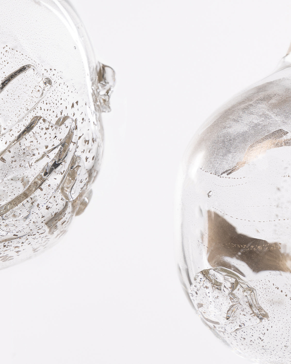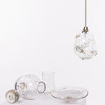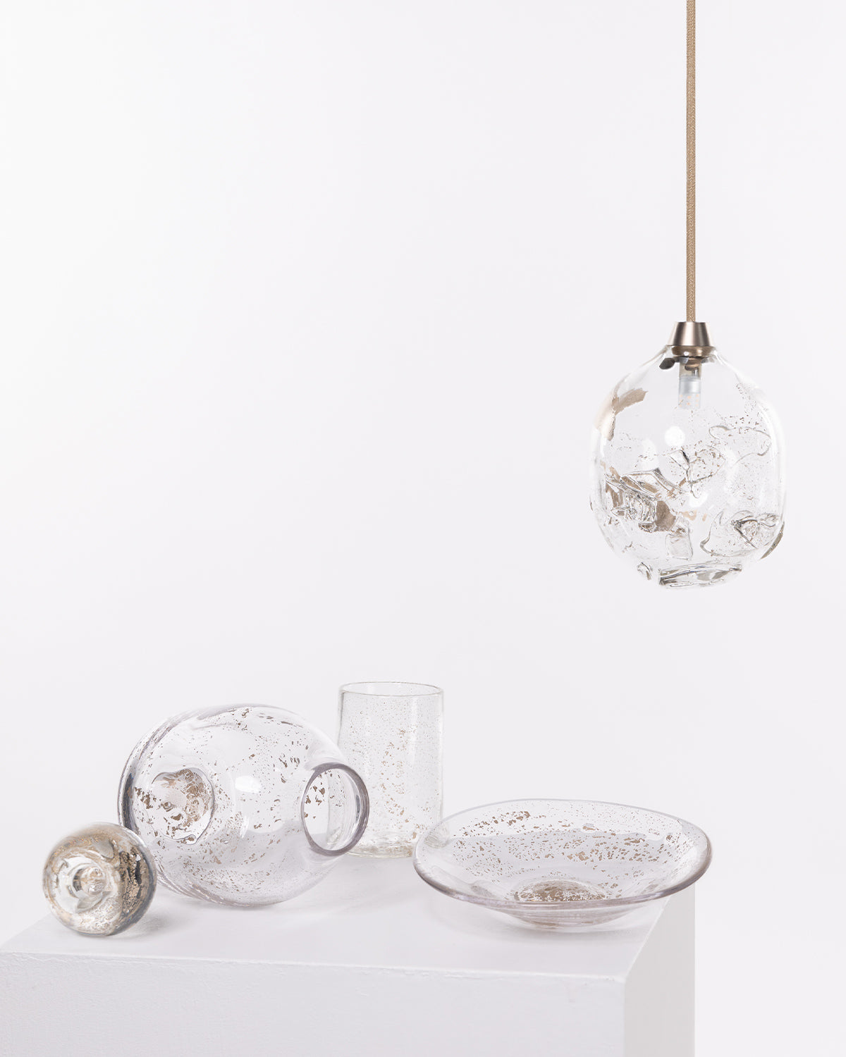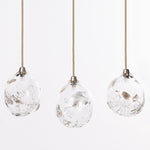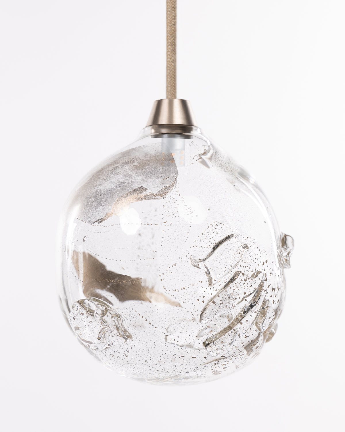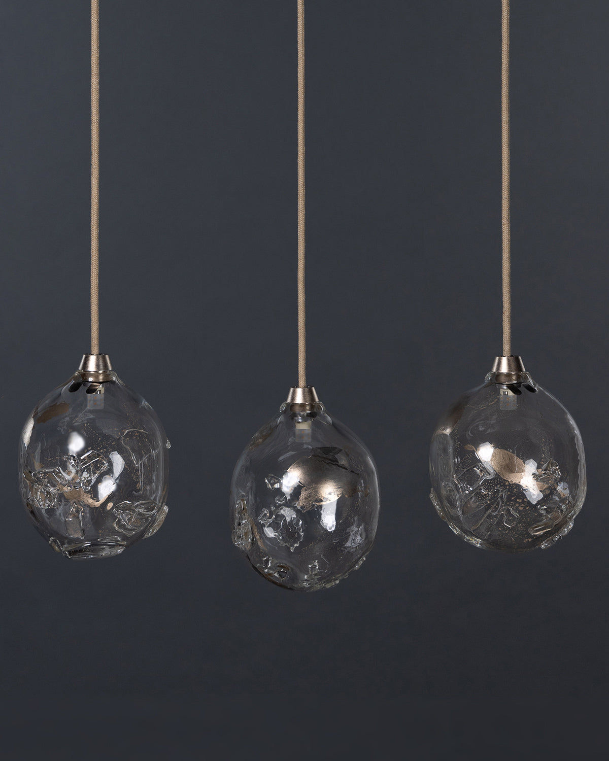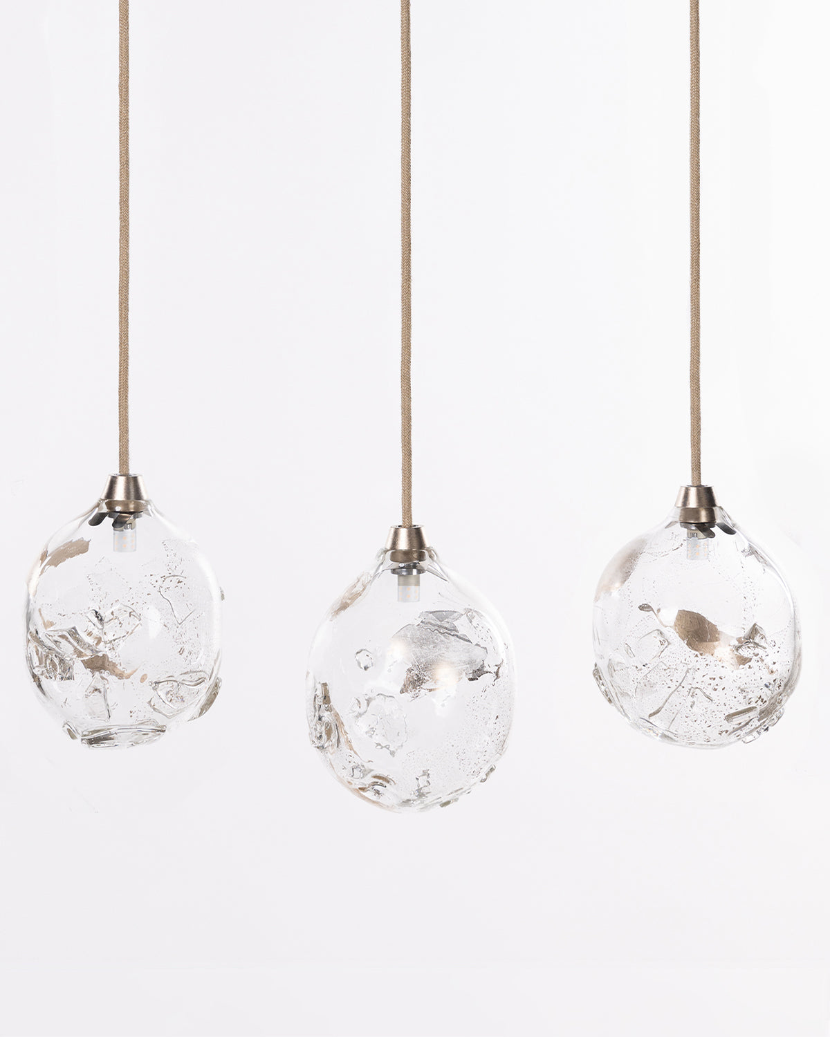 Introducing LUNE III, a set of three handblown glass pendant lights inspired by the moonlit sky. Each pendant features textured glass excess from our FLECK collection and shimmering gold leaf inclusions. These pendants capture the essence of lunar landscapes, transforming any space into a serene, moonlit sanctuary. Complete with gold lacquered fittings and natural jute cables.