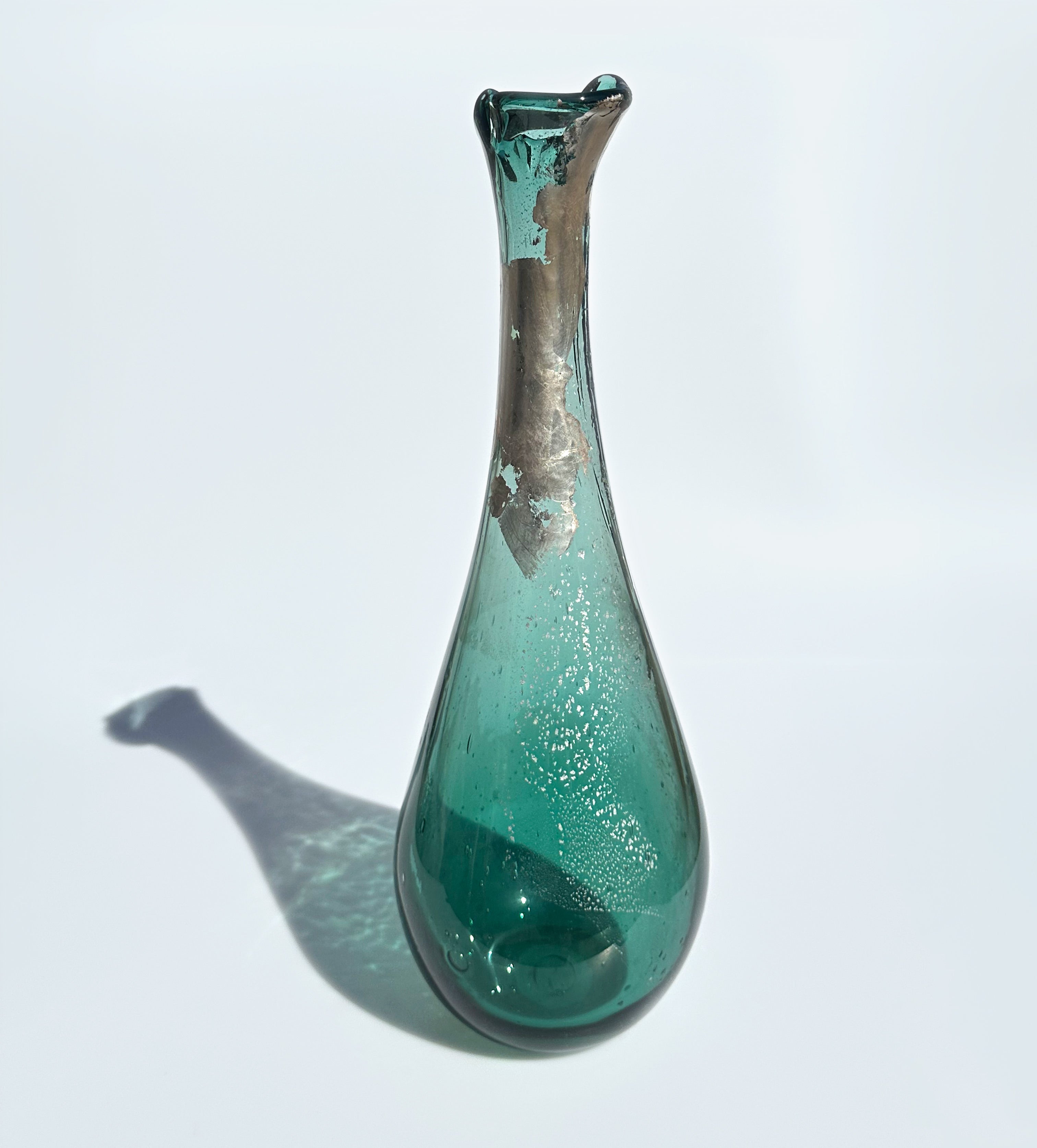 The Zephyr Collection draws inspiration from the dynamic angles of a sailboat, with the vessel and sails set in contrast to the fluid, shifting movement of the sea. First conceived in 2017 during time spent sailing in Bermuda, each piece is sculpted from handblown glass with delicate layers of silver leaf. This is the final piece from the original Zephyr Collection which uses Tourmaline Green.